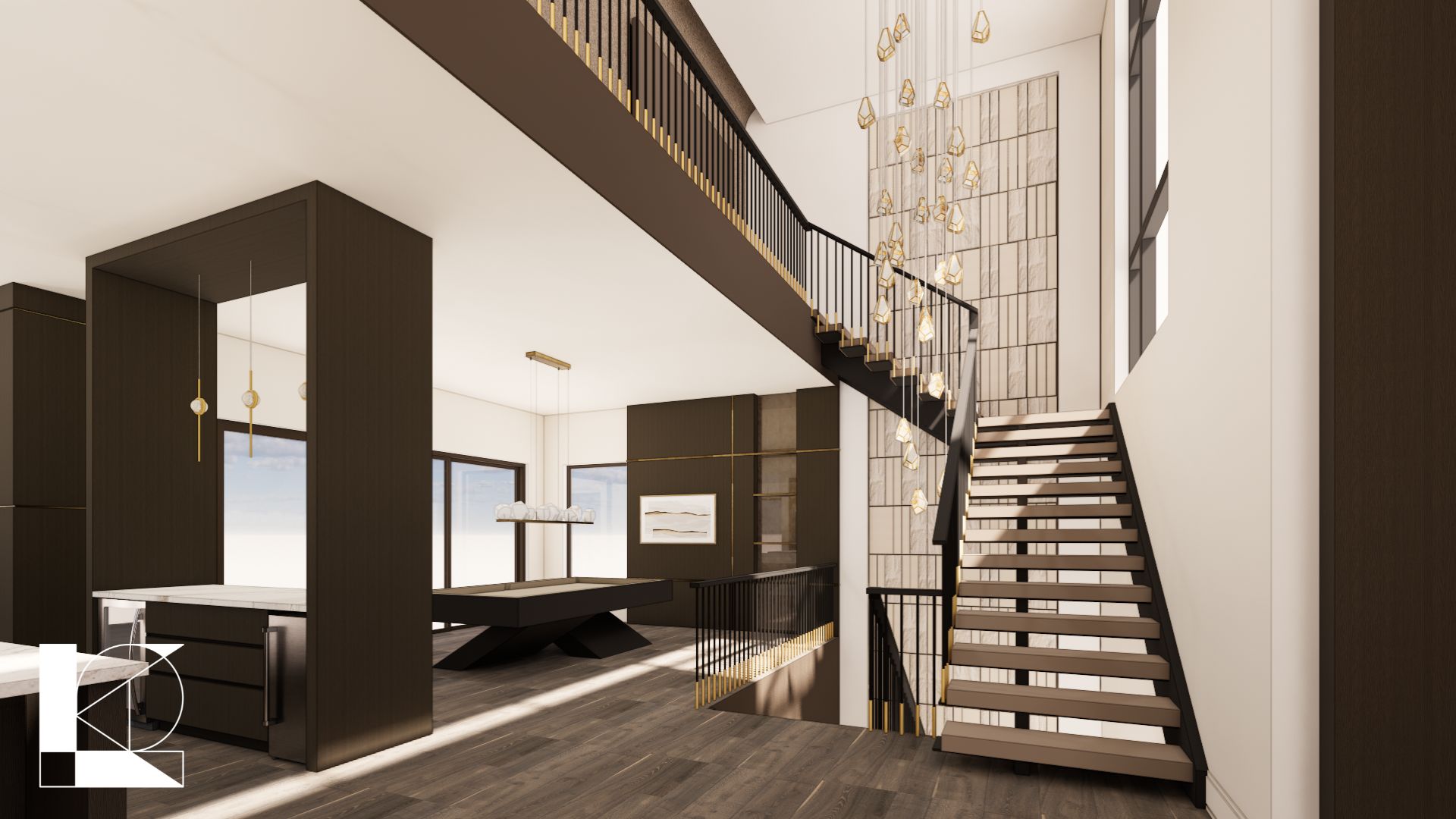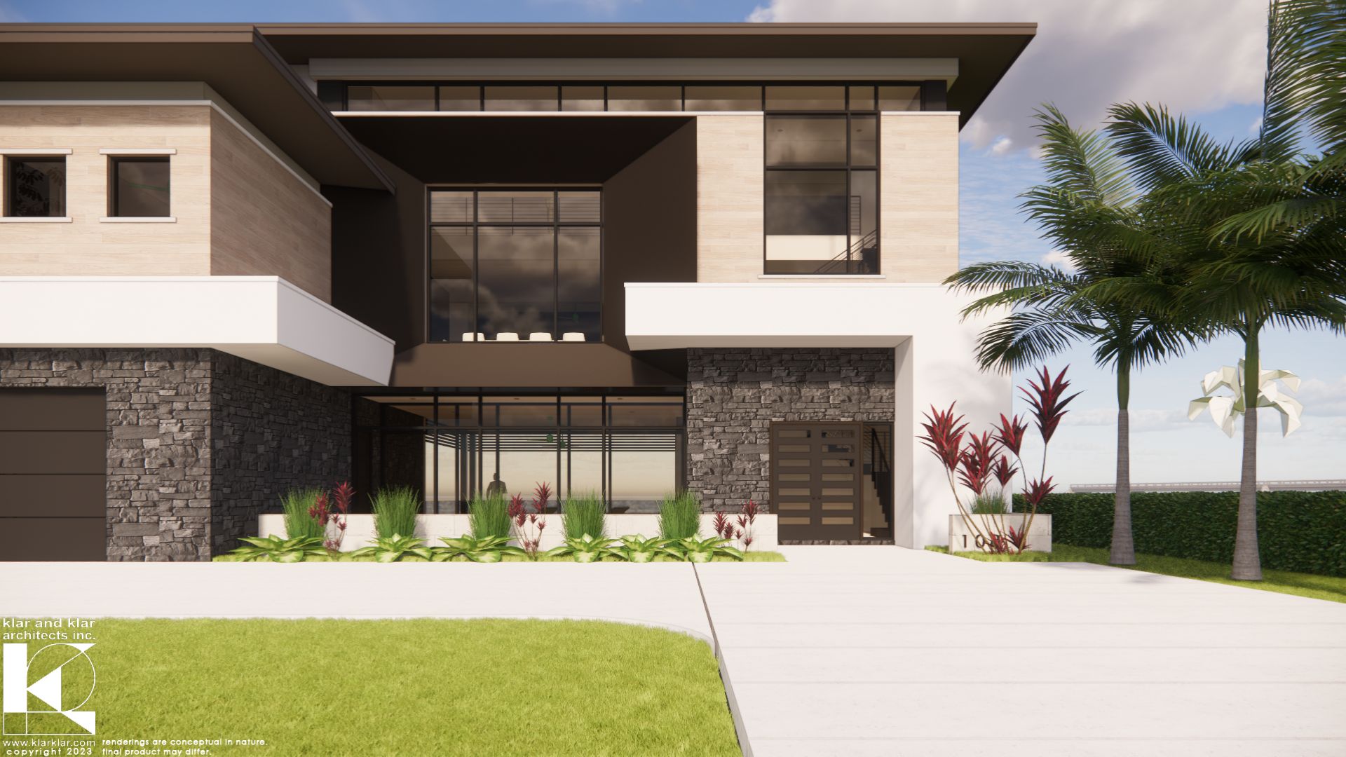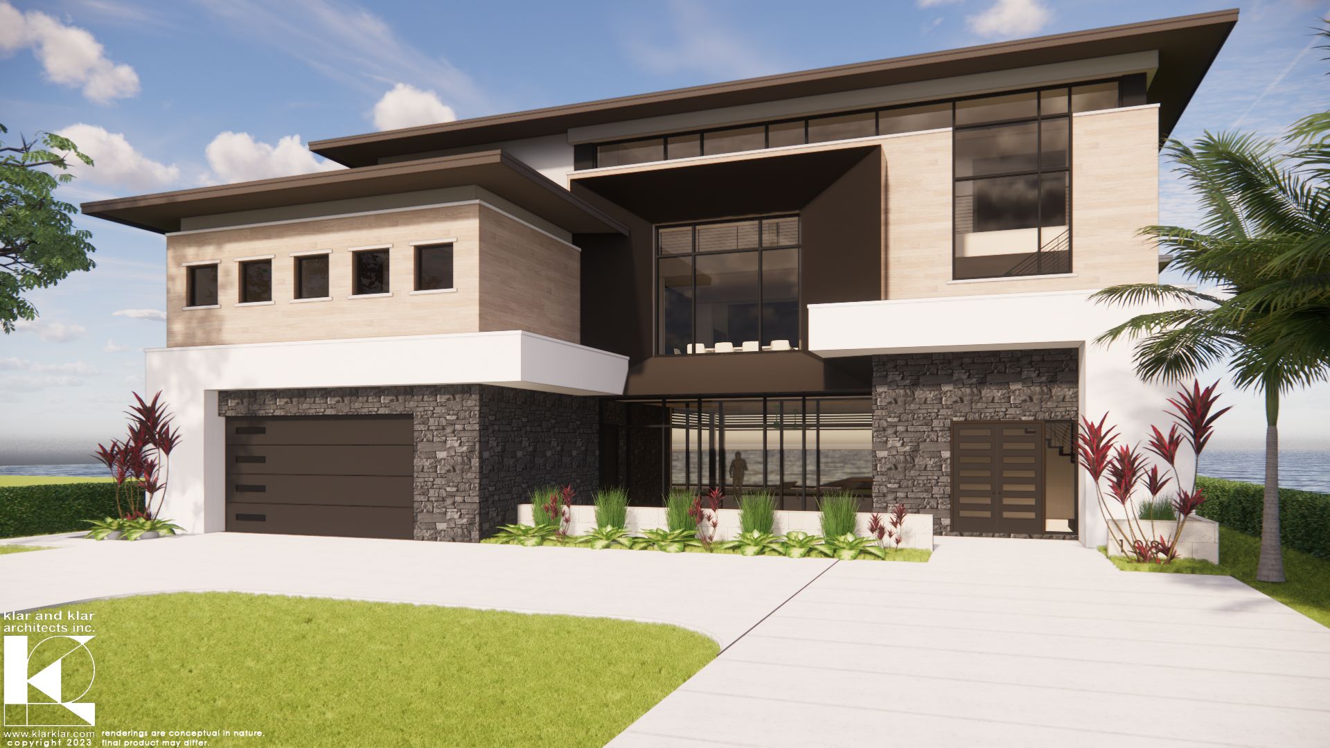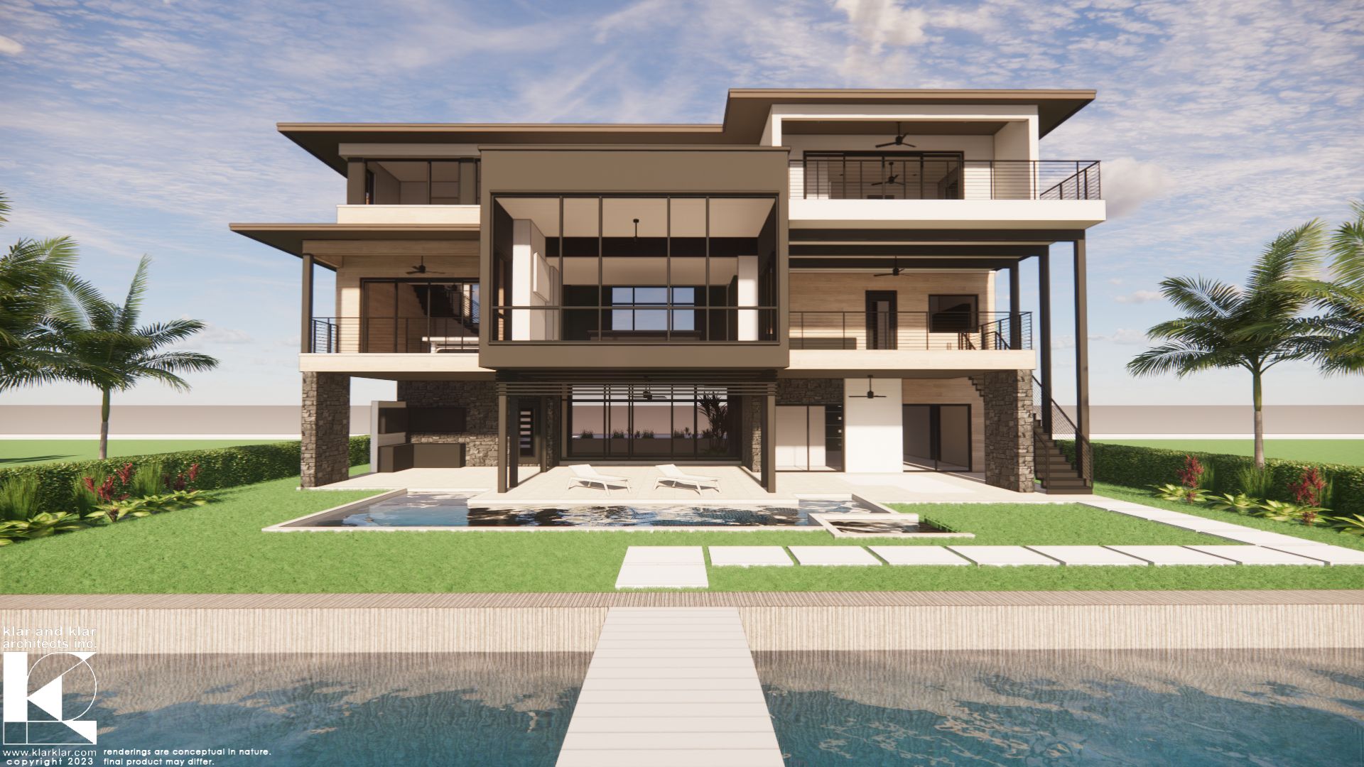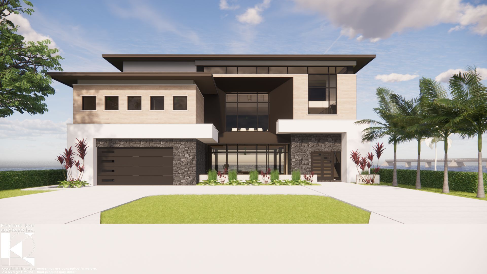 Contemporary modern residence with a touch of glamour overlooking the Belleair Bridge on the Intracoastal Waterway. This 4,600-square-foot home (8,400 square feet total) features three bedroom suites, an office, expansive indoor-outdoor living areas, and a custom feature wall with a thoughtfully designed stair. Klar and Klar Architects also provided interior design and furniture selections.